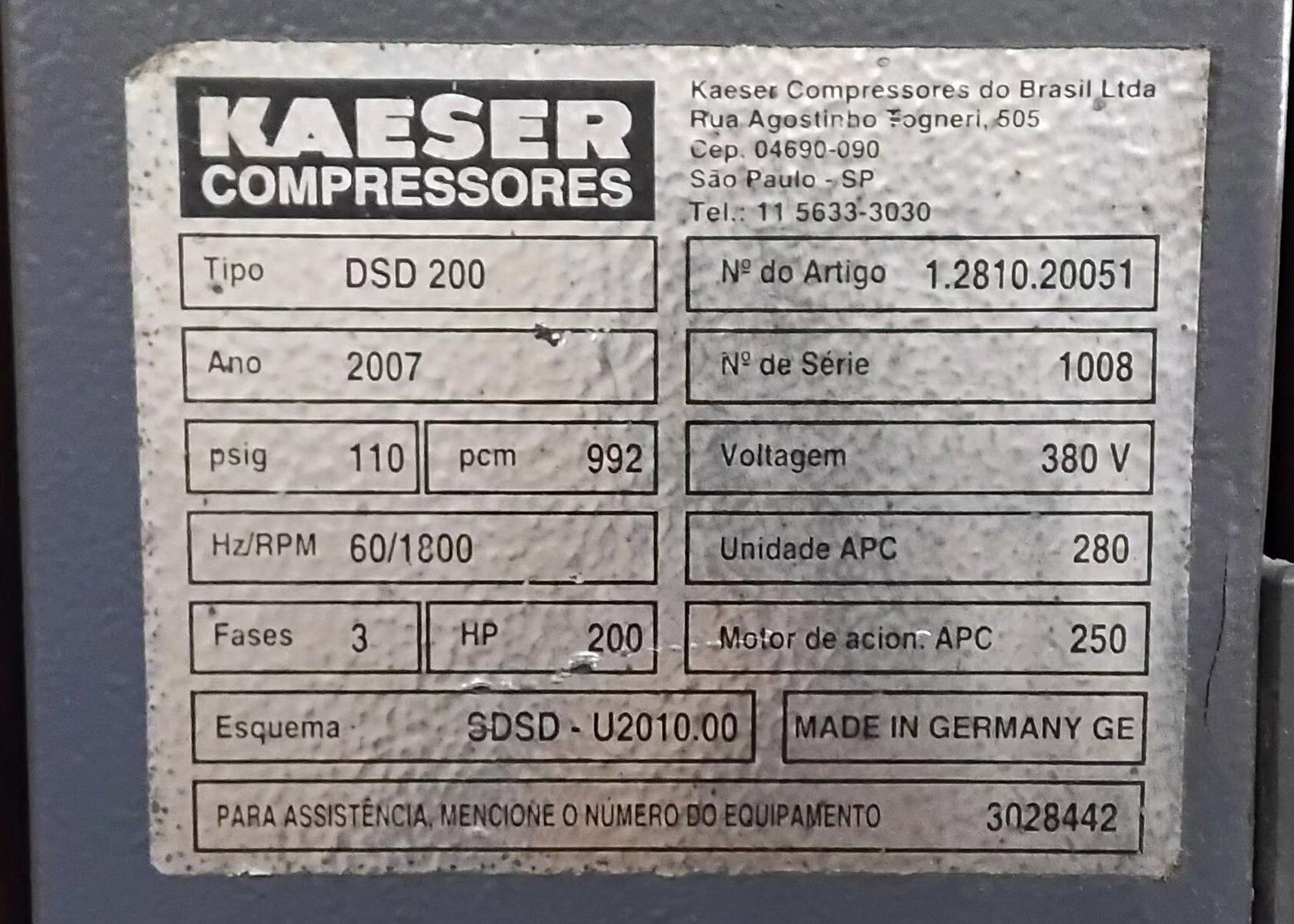 Compressor elétrico Kaeser 200 HP – Frota 119 Vazão 992 pcm 8 bar – 380 V Ano 2007 Horímetro – 51085 horas FUNCIONANDO