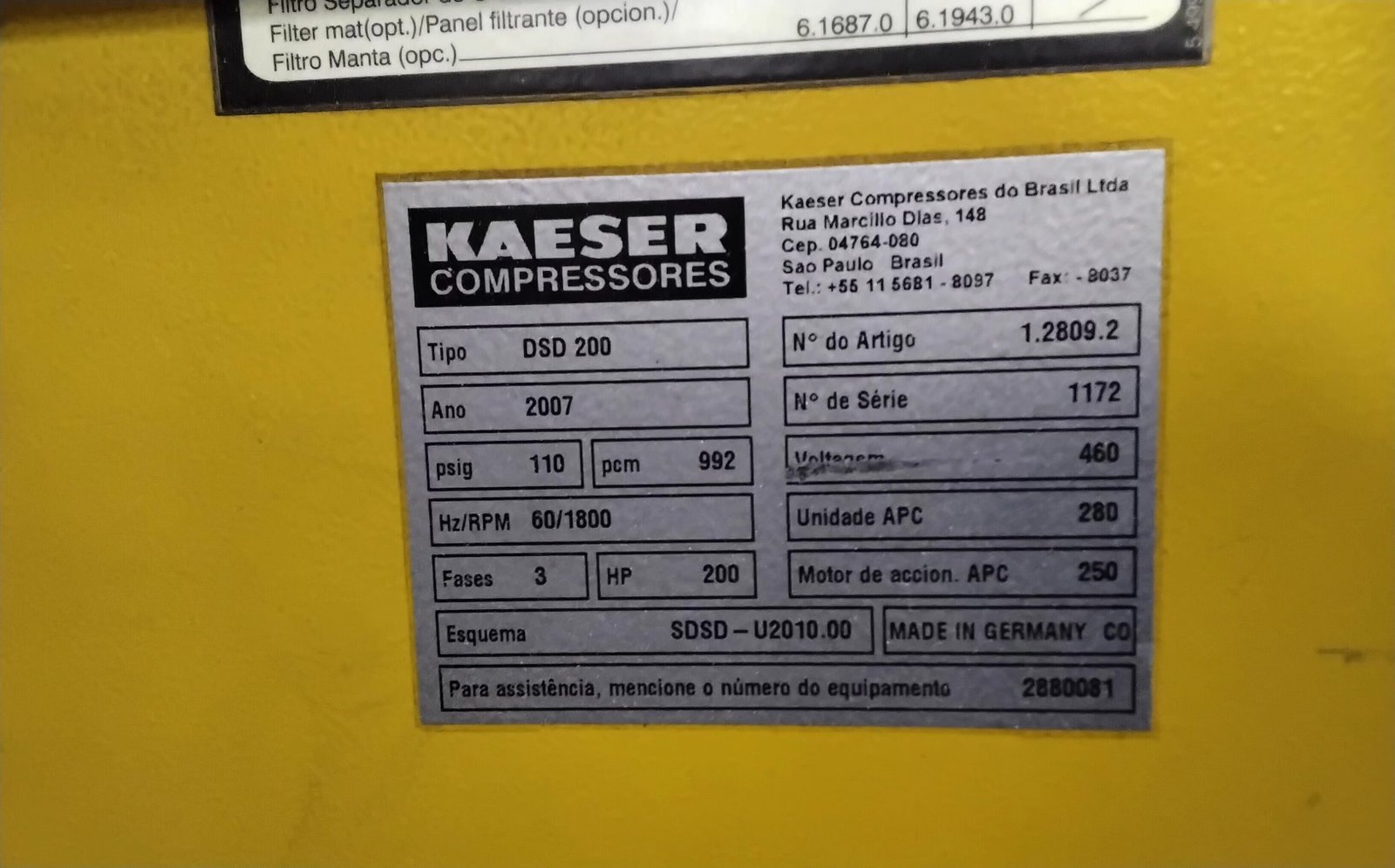 Compressor elétrico Kaeser 200 HP – Frota 869 992 pcm 8,5 bar – 440 V Ano 2007 Horimetro – 61229 horas R$ 80.000,00 FUNCIONANDO